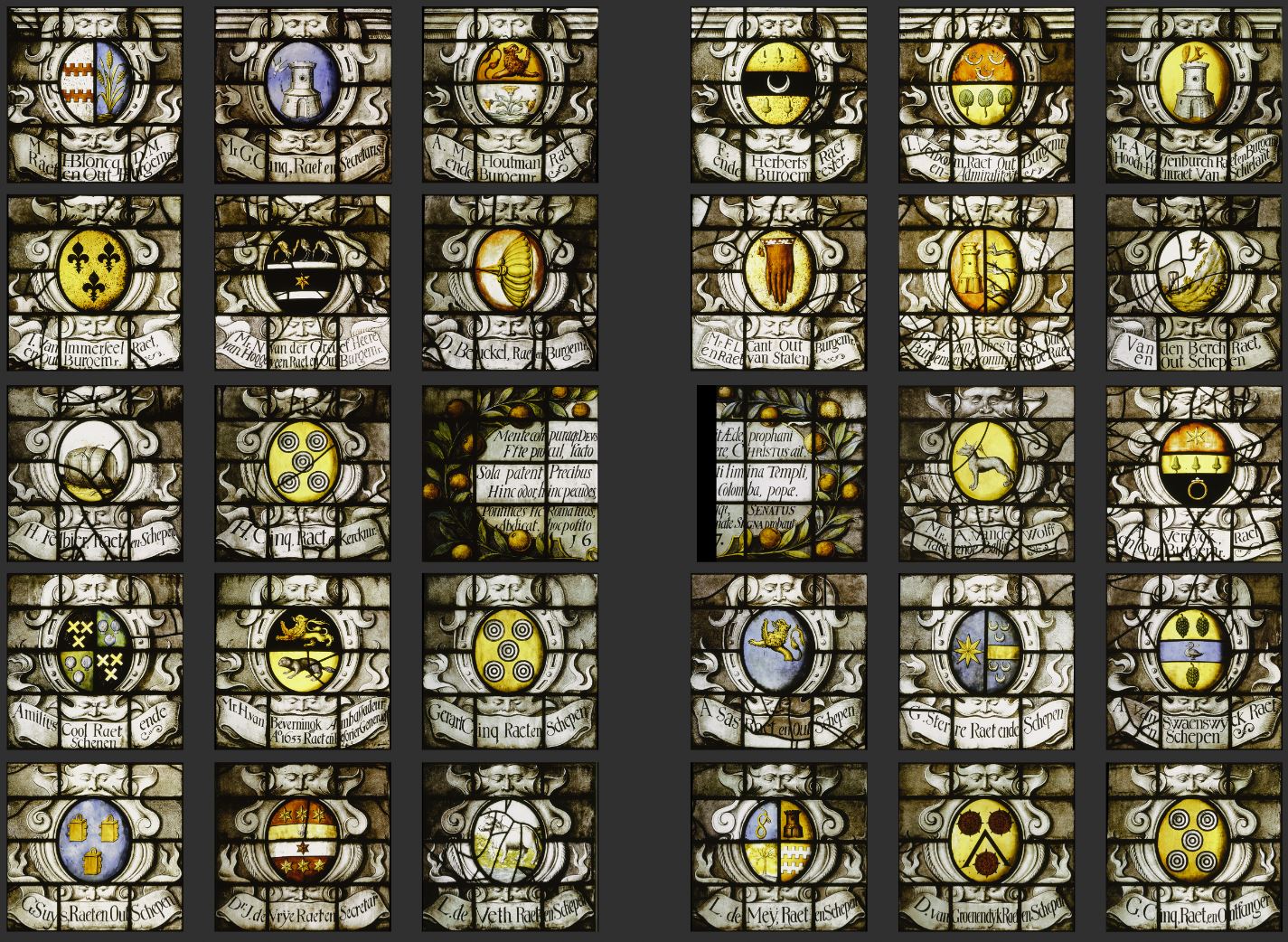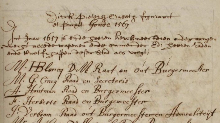 Als we goed kijken naar de schenkersrand dan ontdekken rechtsboven, de tweede van rechts, de naam Verboom. Op het raam is te lezen: I. Verboom Raet Out Burgemeester en Admiraliteit. Jacob Verboom was op dat moment lid van de raad en oud-burgemeester van Gouda (dat was hij in 1652, 1653 en 1655 geweest). Daarnaast was hij op dat moment namens Gouda lid van de Admiraliteit van Amsterdam, een functie die hij van 1656 tot 1658 bekleedde. In andere delen is meer hierover te lezen.